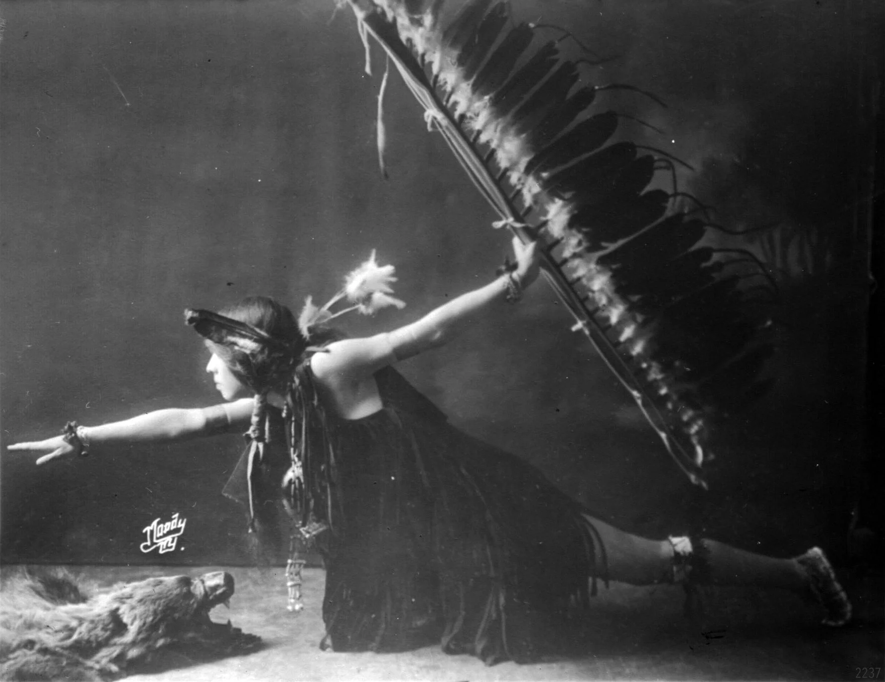In a very theatrical shot for the time, a young woman soars like the Eagle staff she wields, in a very dynamic pose. (Courtesy: Kanien’kehá:ka Onkwawén:na Raotitióhkwa Language and Cultural Center)