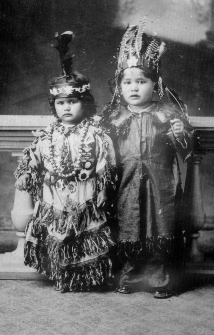 Rose and Wallace Montour, at the young ages of 3 and 5 respectively, are adorned in traditional outfits that are handcrafted by their grandmother, Kawennawi Montour. Circa 1924.(Courtesy: Kanien’kehá:ka Onkwawén:na Raotitióhkwa Language and Cultural Center)